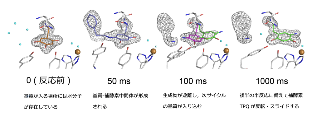 銅含有アミン酸化酵素は様々な生物種に広く存在し,アミン類をアルデヒドとアンモニアに分解する活性を持っています。この酵素の活性中心には,銅イオンと補酵素トパキノン(TPQ)を含んでおり,ヒトの血清中の本酵素は糖尿病の発症にも関与しています。これまで,本酵素は触媒過程で,補酵素TPQが大きく構造変化することが知られていましたが,どのような仕組みで構造変化が起きるのかその詳細な仕組みは不明なままでした。そこで,この疑問を明らかにするため,研究グループは,微生物由来の銅含有アミン酸化酵素を用いて数μmサイズの微結晶を作成し,SACLAにて二液混合法を用いた時分割SFXを実施しました。酵素微結晶懸濁液と基質溶液の混合からXFEL照射までの時間(遅延時間)が異なる複数のデータセット(22 msから100 msまで計9セット)を取得しました。遅延時間の増加に伴い,補酵素TPQとその周辺残基や水分子の電子密度の形状と占有率が変化していることを観測し,反応時間軸に沿った各反応中間体の構造変化を明確にとらえることに成功しました(図1)。