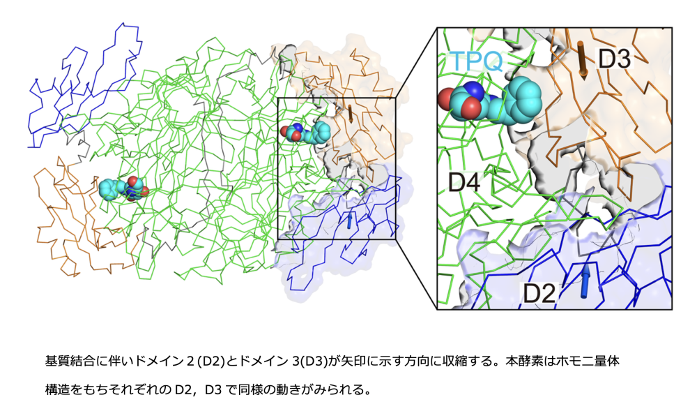 さらに,本酵素の触媒過程での構造変化は活性中心のみで起こると従来は考えられていましたが,基質結合に伴いドメインレベルでの構造変化が起き,これに連動して活性中心での構造変化が進行することが明確になりました(図2)。