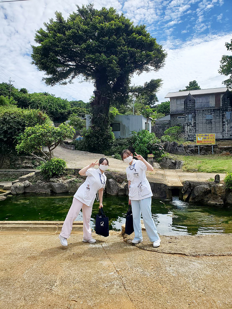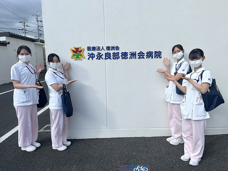 看護学部では、2013(平成25)年度より、へき地医療の実際を体験することを目的として、鹿児島県沖永良部島における離島実習を実施しています。この実習は、地域住民の生活・文化・環境などの社会特性を理解するとともに、社会における看護の役割や位置づけを学ぶことを目標としています。実習先は、沖永良部島で唯一の病院機能を有し、島民の70%以上が受診する沖永良部徳洲会病院で、外来から病棟(新生児室・手術室・集中治療室等)にいたるまで幅広い部門を経験するとともに、現地住民との交流も深めています。